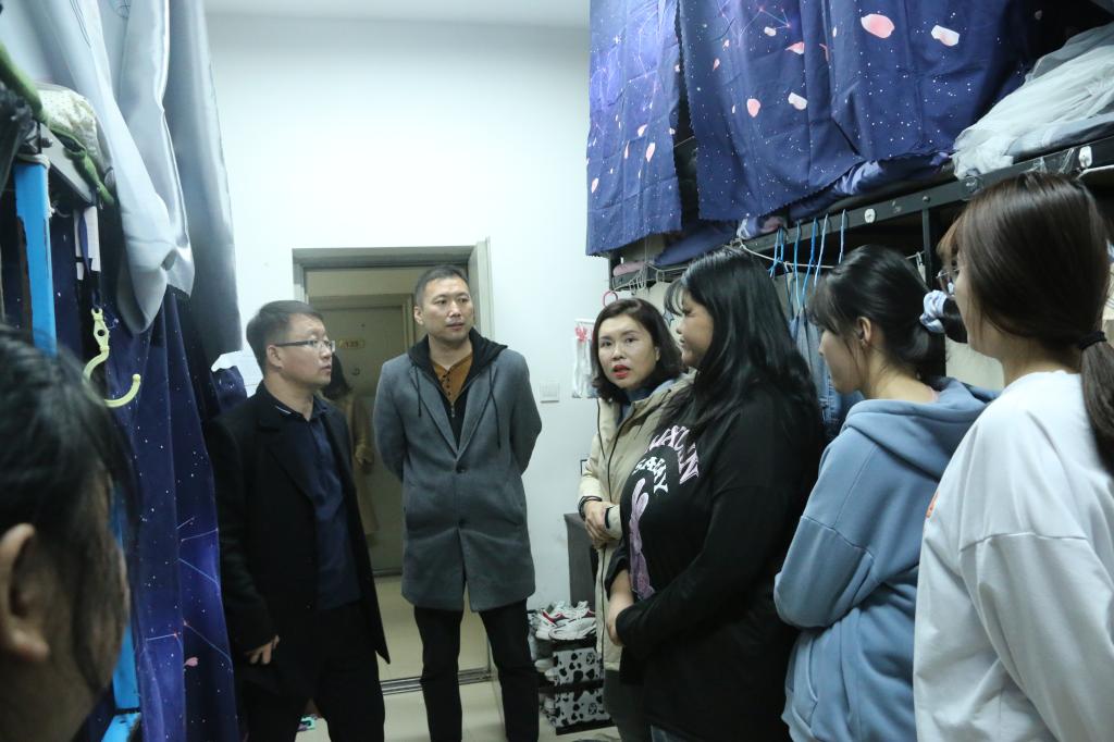 情况。并与同学们进行亲切交流,关心同学们的生活状况,亲切的告诉同学们寝室内