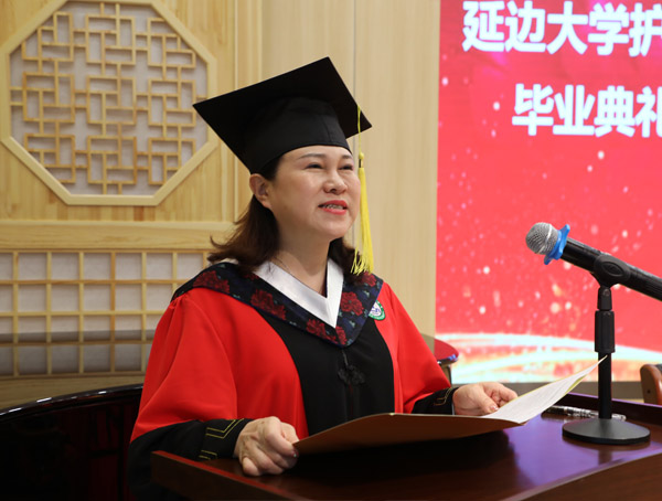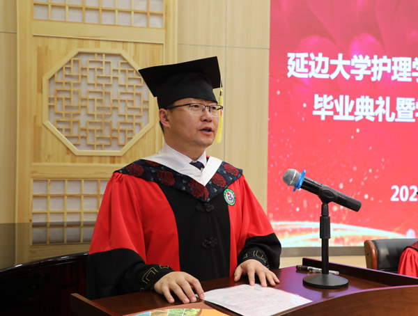 随后,2017级护理学专业邵赢赢同学作为毕业生代表发言,她回顾了四年间学习生活中成长的点滴,表达了对母校的不舍,并代表全体毕业生向母校以及各位老师表达了由衷的感激之情,倡议所有毕业生在离开母校后要不负期盼、不辱使命,今天我们以学校为荣,明天我们让母校以我们为荣。吴善玉老师作为教师代表发言,她代表全体老师对毕业班同学送上了深深的期待和诚挚的祝福,希望同学们能在日后的道路上越走越远。最后,崔文香院长发表了对2021届毕业生的寄语,字字句句流露出对毕业生的美好期望和祝福。她勉励同学们在日后的学习工作中,继续秉承“求真、至善、融合”的延大校训和“仁爱、责任、奉献、创新”的护理精神,拥有更远大的理想和更强的社会责任感,崇尚科学、追求真理、敢于探索、不懈奋斗!同时叮嘱同学们,437437必赢国际官网永远是毕业生们的温馨家园,精神港湾,心灵驿站!欢迎毕业生常回家看看!