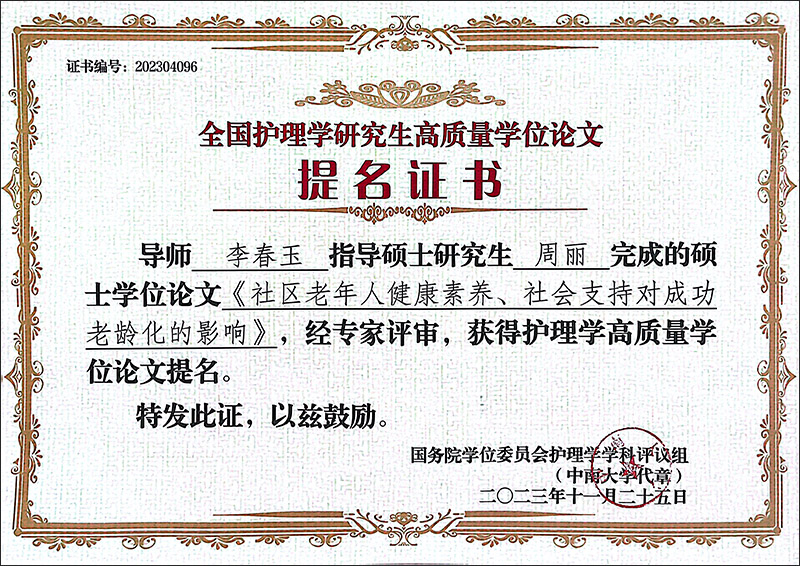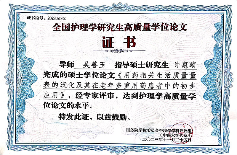 此次大会表彰2019年~2023年已通过答辩的优秀护理学学术学位博士和硕士学位论文。经过推荐、初评、复评,必赢导师指导的护理学学术学位论文,从159篇硕士学位论文中脱颖而出。吴善玉教授指导的2020级硕士研究生许惠婧的学位论文《用药相关生活质量量表的汉化及其在老年多重用药患者中的初步应用》被评选为高质量学位论文奖。李春玉教授指导的2016级硕士研究生周丽的学位论文《社区老年人健康素养、社会支持对成功老龄化的影响》、2019级硕士研究生王岩的学位论文《大学生电子健康素养与健康焦虑对网络疑病症的影响》,被评选为高质量学位论文提名奖。