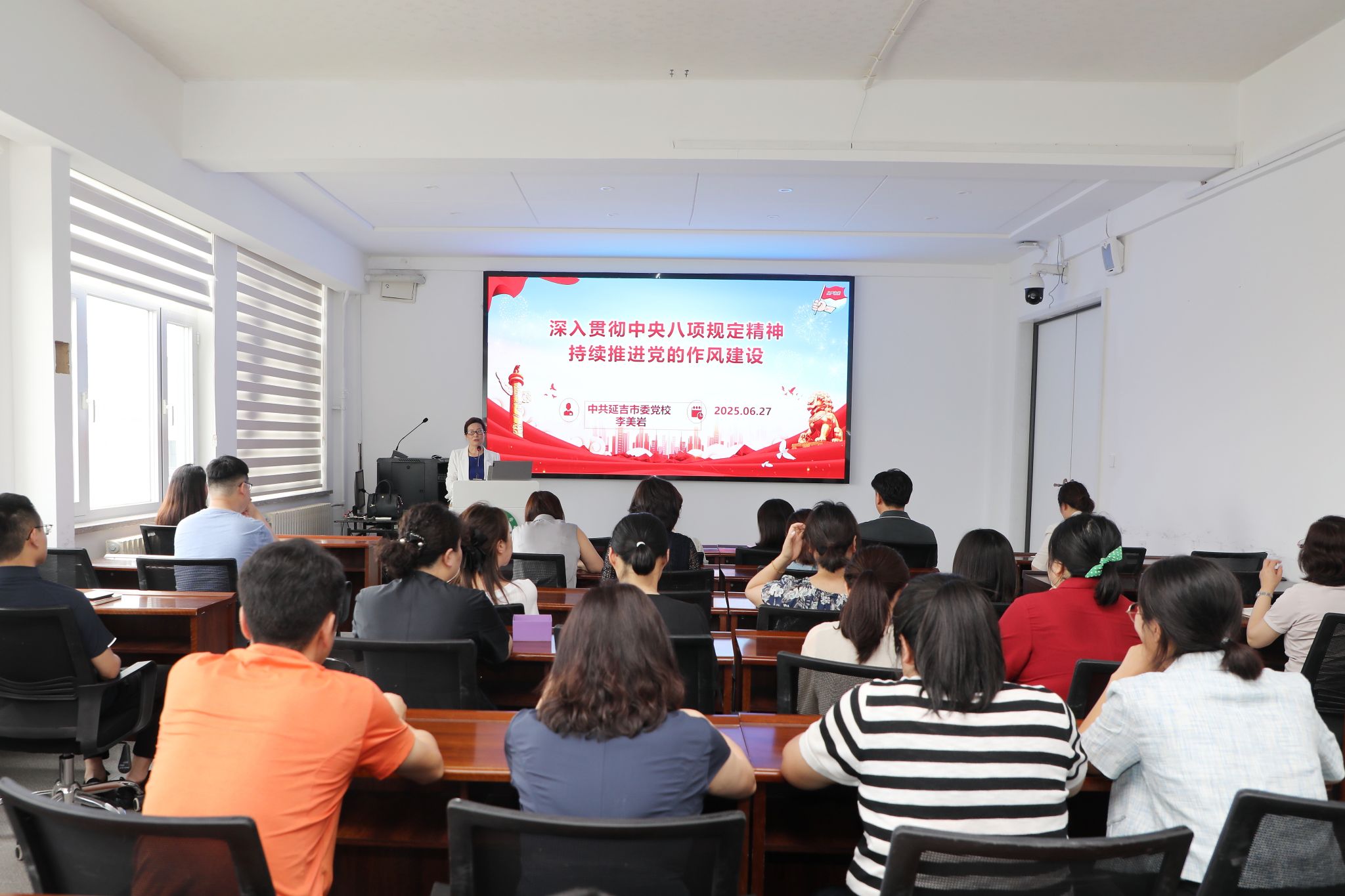李美岩教授以《深入贯彻中央八项规定精神,持续推进党的作风建设》为题,系统梳理了中央八项规定及其实施细则的核心内容,并结合典型案例,从形式主义、官僚主义、享乐主义、奢靡之风四个方面,分析了当前违反中央八项规定精神的突出表现。她强调,作风建设是党的建设的永恒课题,必须坚持"严"的主基调不动摇,以钉钉子精神纠治"四风",推动全面从严治党向纵深发展。