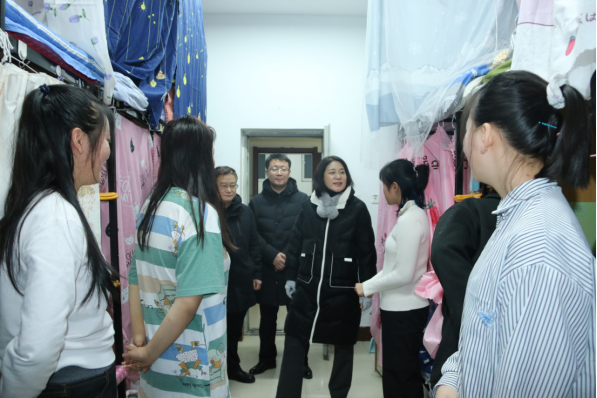 下午5点,各位领导老师在走进寝室与同学们进行亲切交流,关心同学们的生活、学习状况,亲切地告诉同学们寝室内有问题要及时上报,外出注意安全,并叮嘱同学们在疫情防控期间应多开窗通风、还要注意寝室卫生,要注意保暖、预防感冒。金鸿雁书记在走访中强调,一定要遵守学校的住宿规定,同学之间要加强沟通与交流;嘱咐同学们近期各地疫情多发,要注意做好自我防护,减少外出;期末期间认真做好复习,考出好成绩。同学们也纷纷表示在寝室生活中一定会注意自我防范,在日常生活中也会提高安全意识,树立正确的安全观念,寝室长也会履行自己的职责做好每日的检查工作。