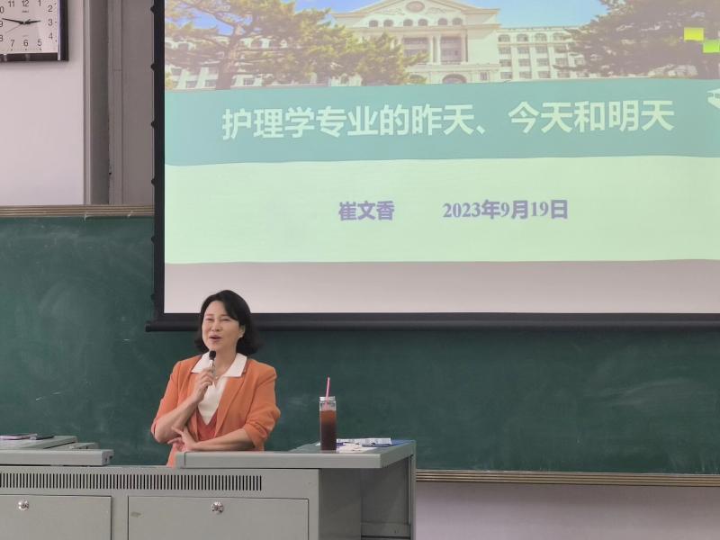 崔文香院长做了主题为“护理学专业的昨天、今天和明天”的专题讲座。首先,崔院长提出四个问题,与在场的同学们进行互动,活跃了现场氛围。随后,崔院长以护理学专业的历史发展为引,分享了中国历代南丁格尔奖章获得者的感动事迹,并针对护理学专业的四大基本理念、任务及范畴、护士应该具备的素质要求做了详细的介绍,与同学们共同展望了专业的未来发展前景。崔院长强调21世纪护理在全球卫生系统中的重要作用,护理人员将成为实现全民健康覆盖、应对突发事件和灾害、积极应对老龄化、提升智慧康养与老年护理服务水平、实现人类健康福祉等诸多方面的主力军。崔院长还强调在“四新”背景下,护理学专业正在与其它医疗保健相关学科,如医学、药学、心理学、营养学、计算机技术与人工智能等专业进行更紧密的合作与交流,这种多学科合作助力会使健康效益最大化,将会更加突出护理的价值,并表述今后通过加强国际交流,传递中国声音,在区域医疗卫生实业发展发挥护理力量,贡献护理智慧。