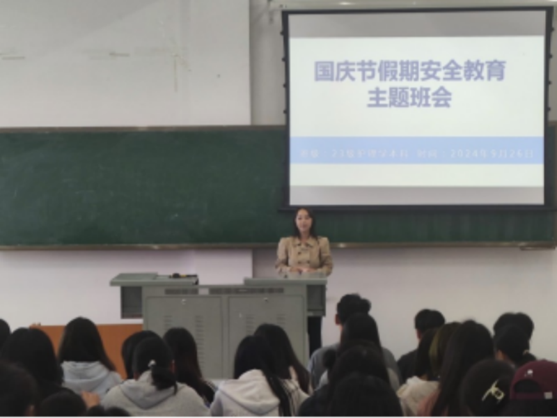 各年级辅导员在主题班会中向学生开展国家安全、人身财产安全、食品安全、实验室安全、交通出行安全等方面的教育,及时回应学生诉求,教育引导学生出行期间乘坐正规交通工具,外出活动期间应注意饮食卫生,预防秋季高发传染病,提高安全防范意识,增强自我保护能力,确保人身财产安全。