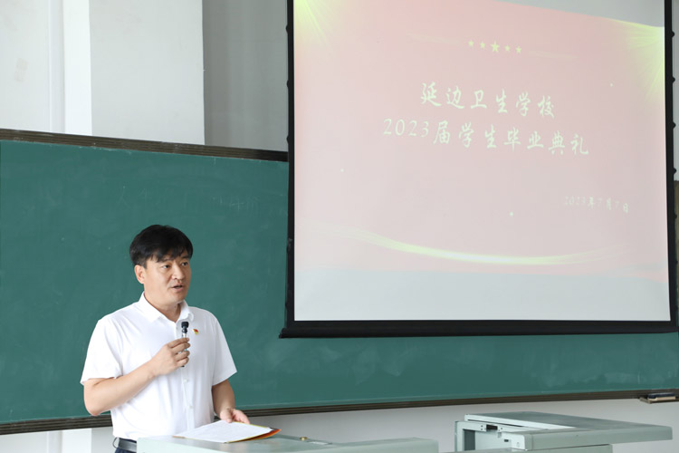 延边卫生学校于2023年7月7日上午9:00时在西部教学楼202教室隆重举行了2023届护理专业学生毕业典礼。校党委书记金鸿雁、校长崔文香、副校长金润浩、党务办公室主任郝金莹、学校办公室主任吴锦姬、教务办公室主任朴龙范、学工工作办公室主任孙凤杰、团委书记尹艺红、人事办公室主任赵冰、工会主席金乃星、班主任刘忠民、张龙、辅导员以及全体毕业生参加了会议,会议由副校长金润浩主持。