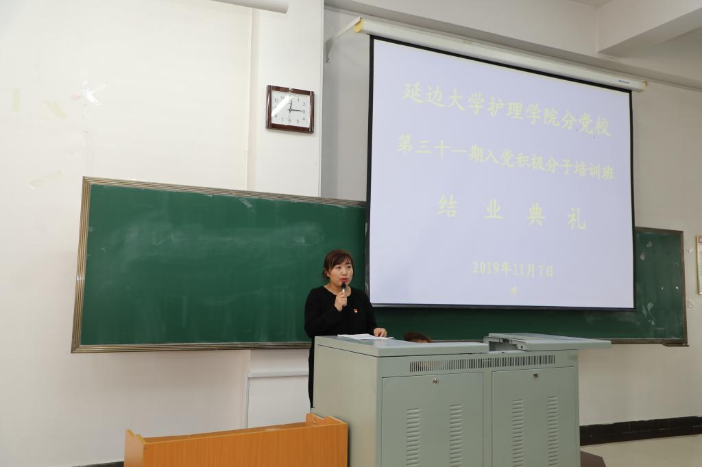 2019级护理本科班朴丽燕同学代表结业生发言。她感谢学院分党校提供了学习、交流及提升自我的平台,并表示在未来的学习、工作、生活中,进一步端正入党动机,努力掌握专业知识,积极参加社会志愿服务,在实践中不断锻炼和提高自己,肩负起新时代赋予的历史使命,争取早日加入中国共产党。