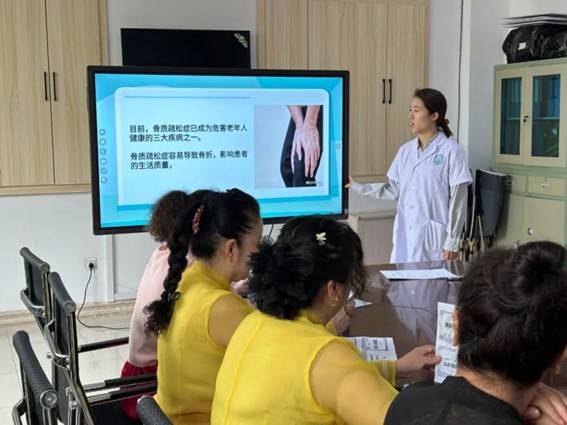 活动开始,志愿者们首先发放调查问卷了解大家对骨质疏松的认知程度,随后通过幻灯片生动讲解什么是骨质疏松、哪些诱因会导致骨质疏松、骨质疏松有哪些症状、如何避免发生等内容。志愿者们着重讲述了主要的病因包括年龄、性别、遗传、饮食能力、运动习惯等,而症状则可能包括疼痛、身高缩短、驼背等,提醒居民平日饮食要少油少盐,优先选择鱼和鸡鸭等禽类补充蛋白质,保证蔬菜、水果摄入;减少久坐,根据自身身体状况选择合适的运动方式,如步行、太极、健身操等。