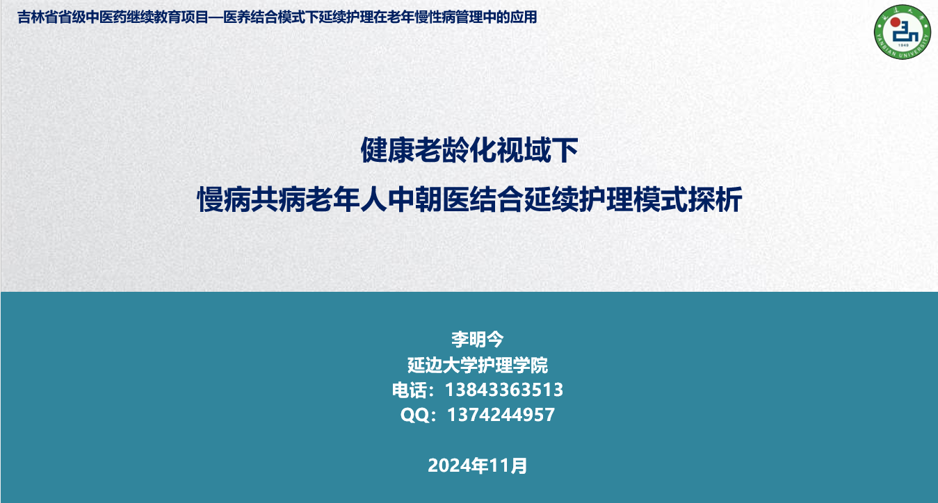 必赢李明今教授于2024年11月8日,在吉林省中医药继续教育项目中,基于"医养结合模式下延续护理在老年慢性病管理中的应用培训班"上作《健康老龄化视域下慢病共病老年人中朝医结合延续护理模式探析》为主题的专家讲座,为优化老年慢性病管理提供思路和方向。