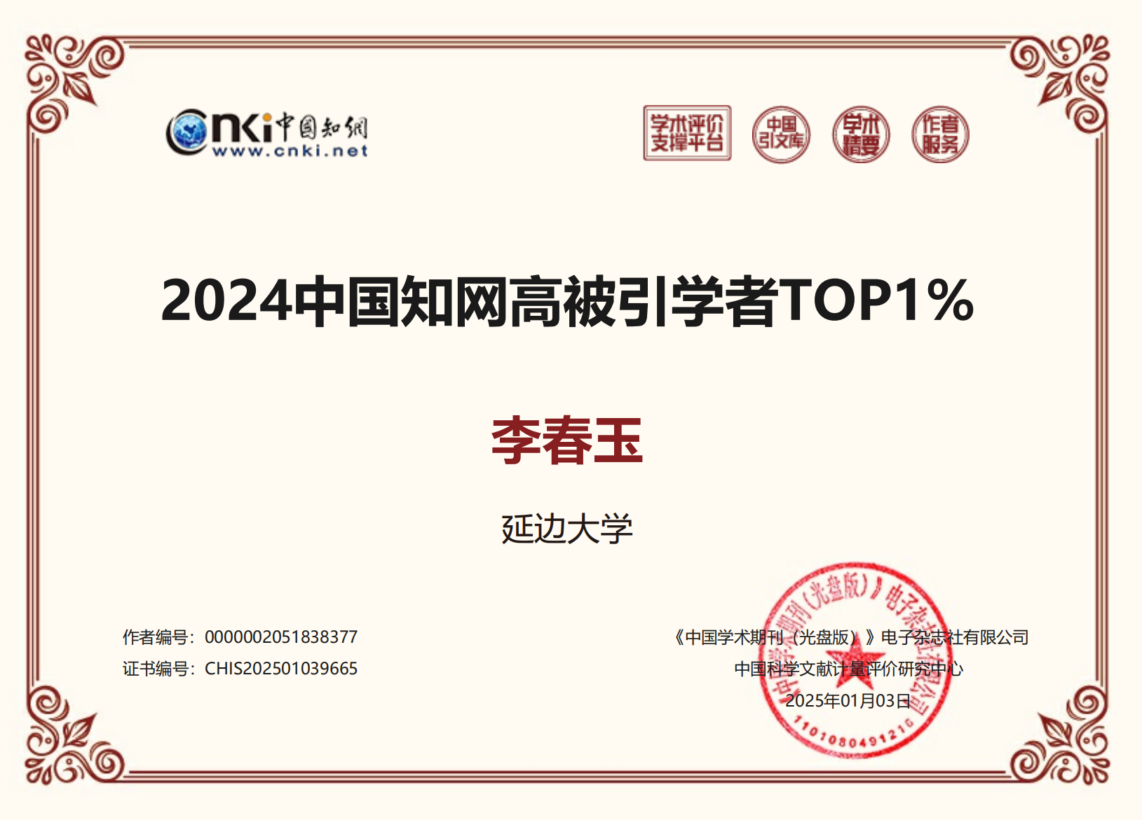 中国知网资源总库遴选各学科代表性论文,并为单篇代表作提供定性与定量评价数据,遴选各学科高被引论文,从多个维度为高被引论文提供分析。近日,对中国知网收录的近十年的论文数据进行统计,按PCSI、被引频次、下载频次的高低分别排出前1%的高影响力研究论文,筛选出护理学者Top1%有764人,Top5%有3284人。其中,必赢李春玉教授被评为“2024中国知网高被引学者TOP1%”。